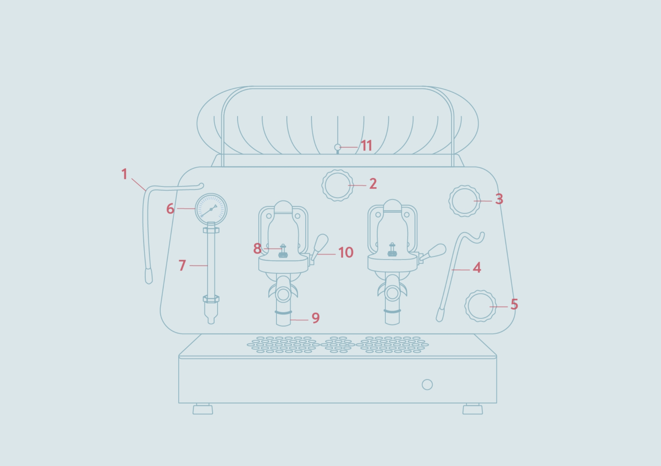 カップウォーマートレイの上にある小さな赤いノブは、マシンのボイラー上部のパネルの穴を閉じたり開けたりするプレートを動かします。両方のボイラー上の穴が開くと、バリスタはカップを素早く温めることができます。