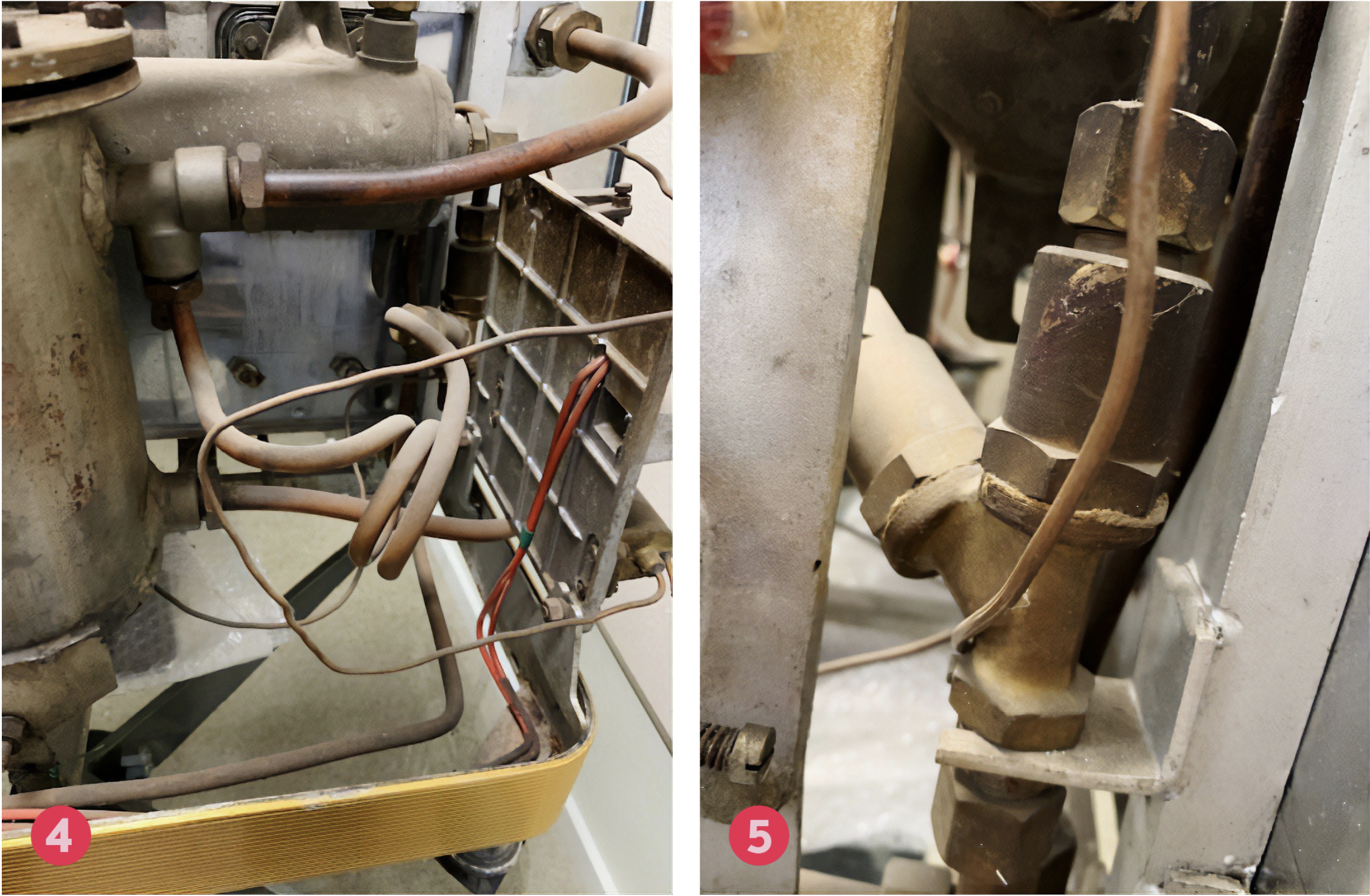 1: 圧力調整器(プレッシャースタット)が見える背面図 2: サーモスタットの側面図 3: スチームボイラーの上面図 4: スチームボイラーの安全弁へ向かう経路の背面図 5: 安全弁のクローズアップ図