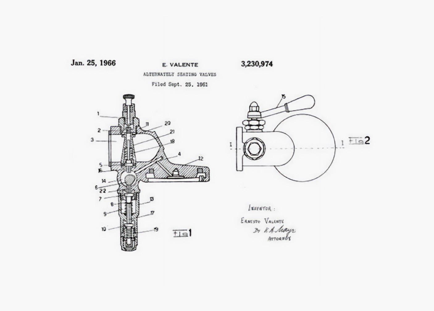 こちらは、E61に採用されたヴァレンテのグループヘッド設計に関する特許図面と、それより2年前に開発されたTRRの図面です。