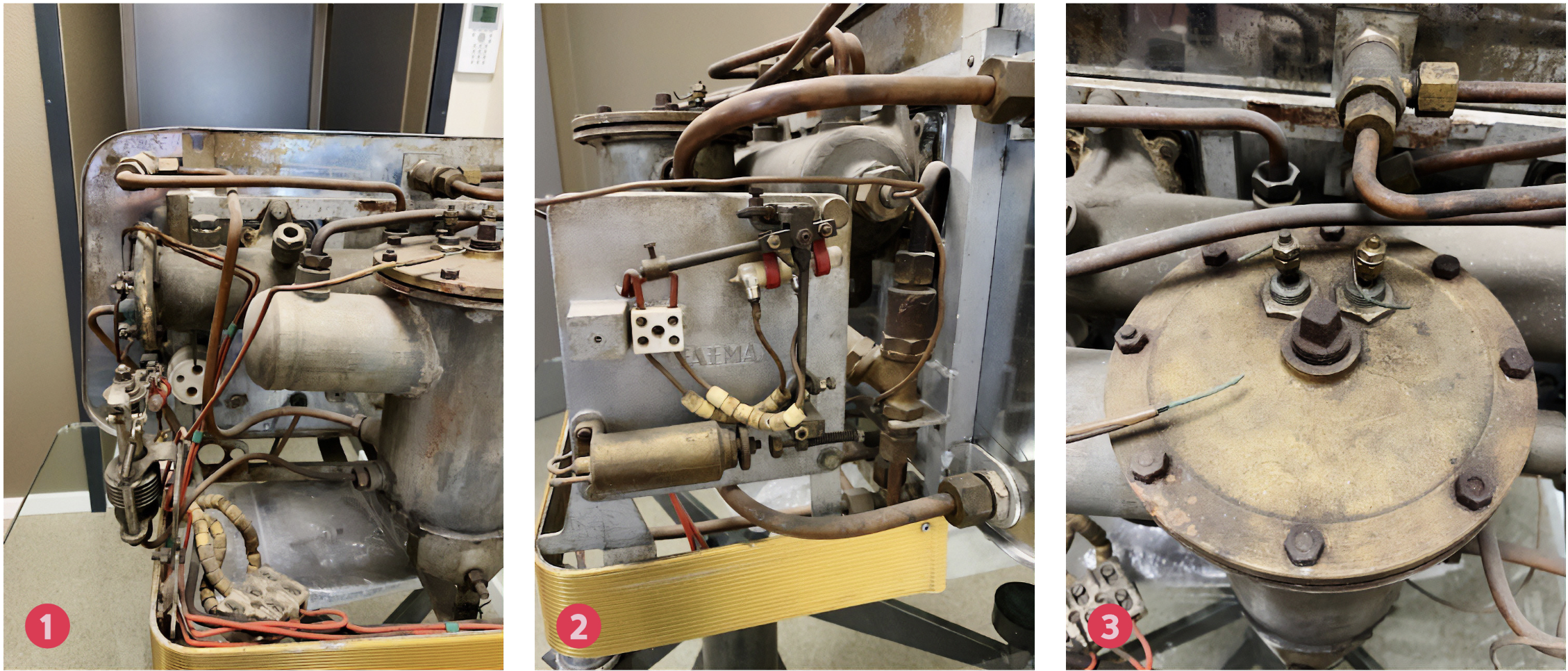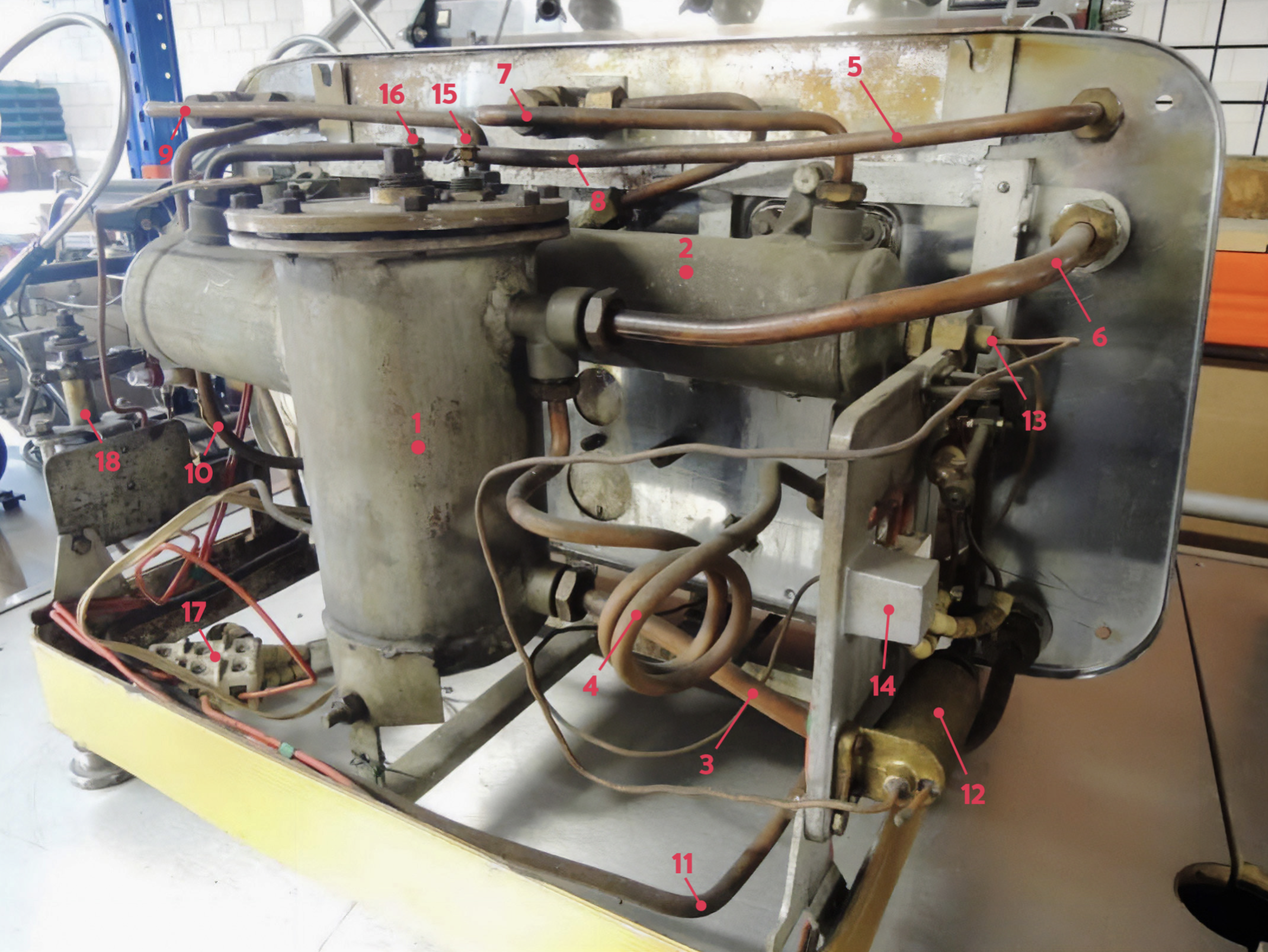 この機械には逆流防止弁(アンチバキュームバルブ)はありません。この時代のマシンの電源を入れる際、バリスタは蒸気バルブを開けたままにして蒸気が出始めるまで待つ必要がありました。