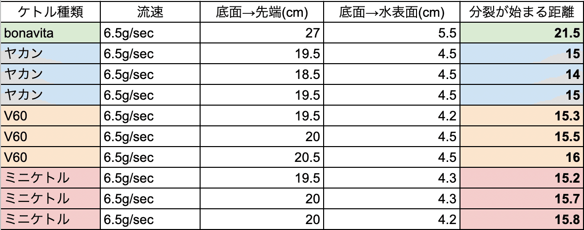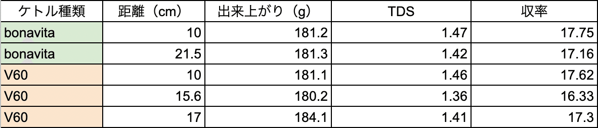 では実際にBonavitaとV60のケトルを用いて、それぞれ分裂の始まる距離とそこから下げた位置での抽出で比較をしてみました。